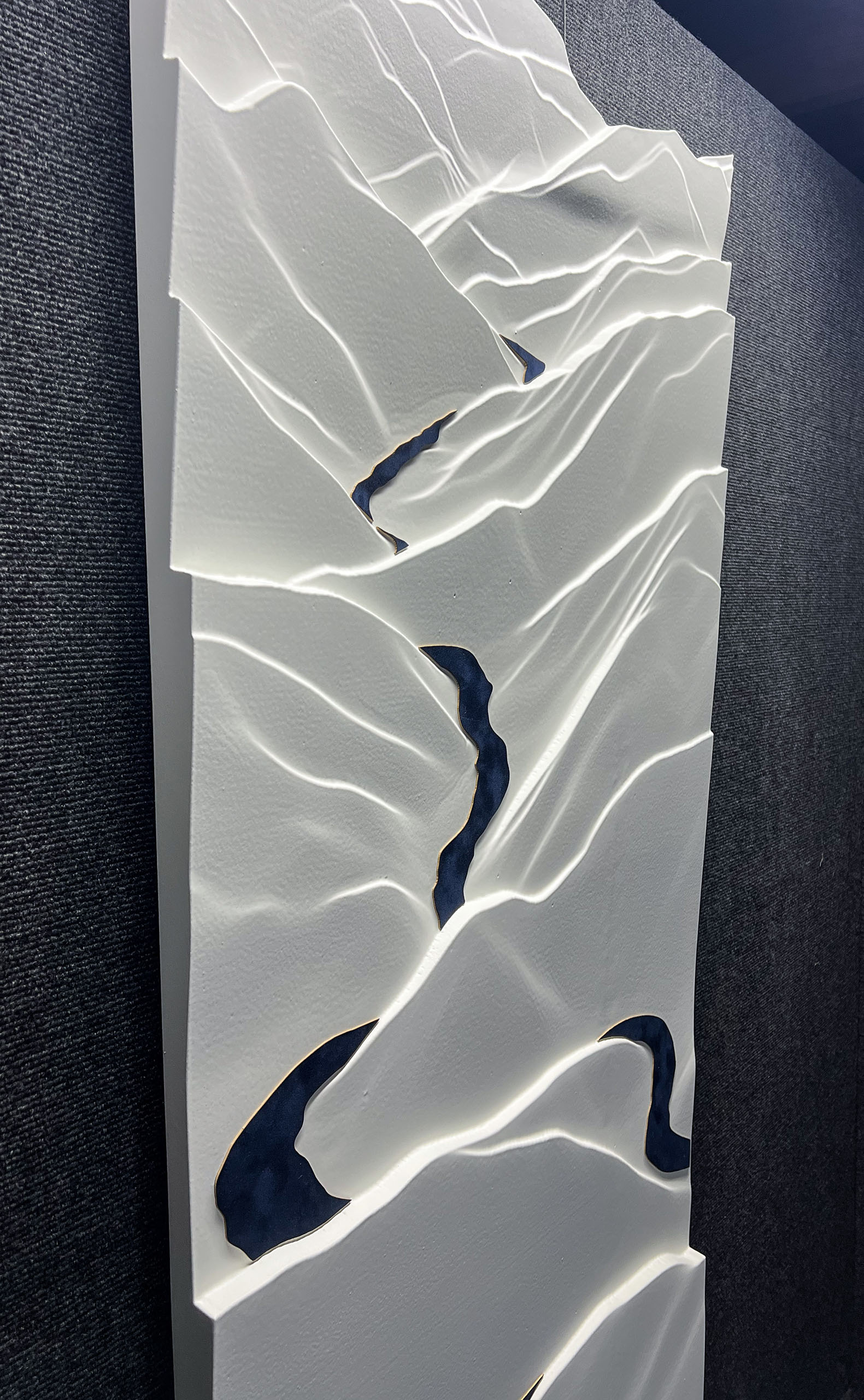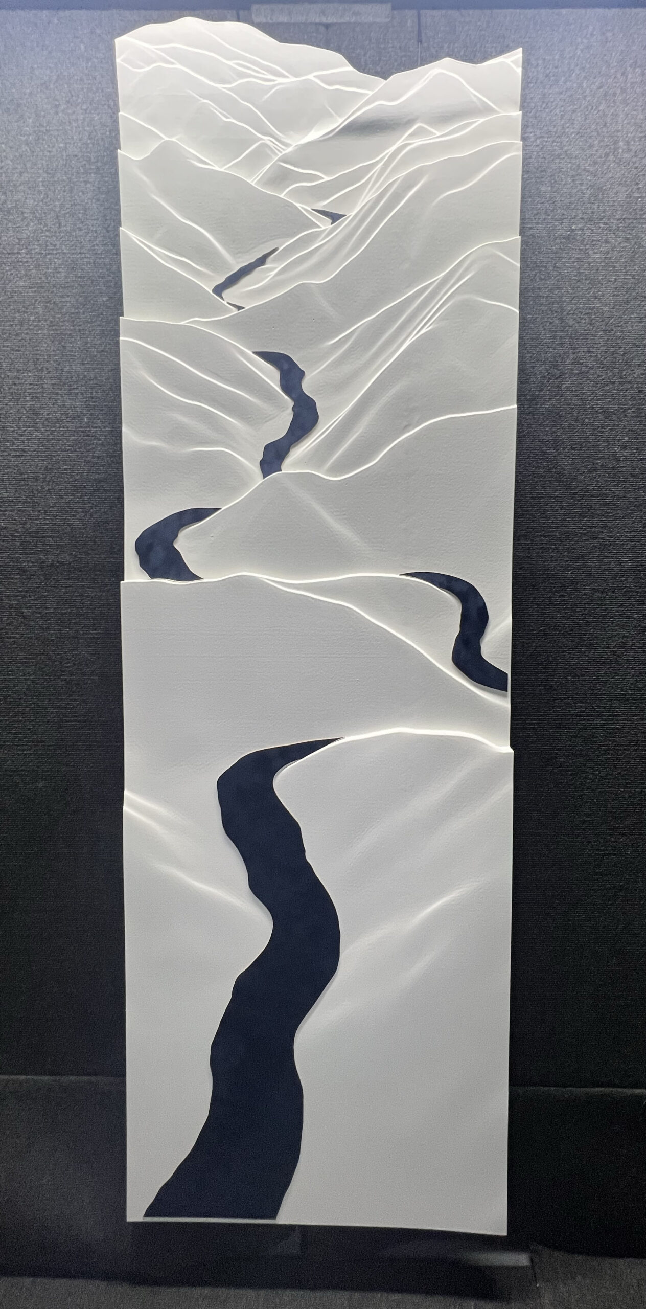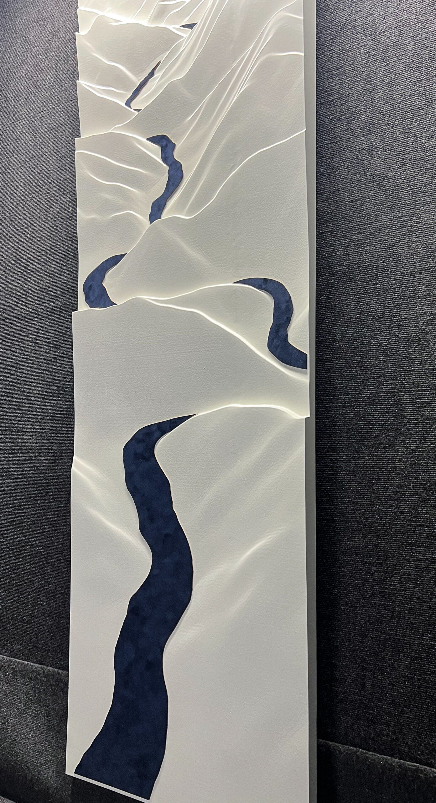 Inspired by the graceful lines of the Blue Ridge Mountains, I wanted to capture the way the river flows through a landscape, but of course you can’t SEE the river with all the trees in the way. So I downloaded elevation data from NASA, and “photographed” the mountain range in my 3D software. From there, I traced out the river and cut it out of blue suede with a lase