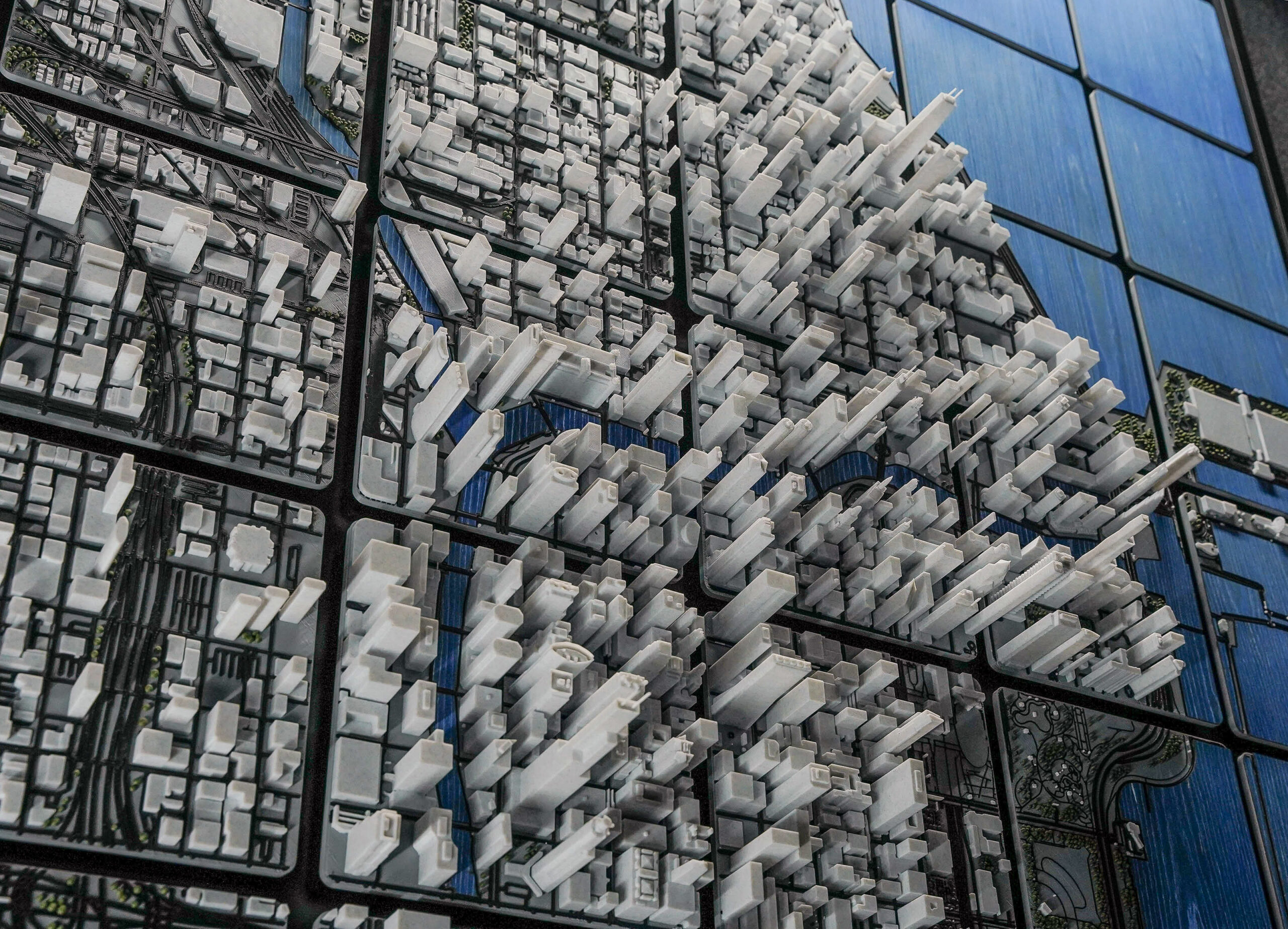 This map of the skyline is made of a series of 10x10” custom-made 3D-printed digital sculptures. The material is a resin that resembles marble. Many people assume it’s hand-carved stone when they see it!