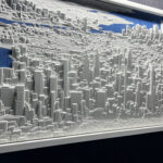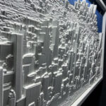 This bas-relief of New York City was created using 3-dimensional data of all the buildings in the city, and a custom workflow to convert building heights into a relief. It’s an extrememly technical workflow that involves a virtual camera to view the buildings from a perspective and convert them to a heightmap.